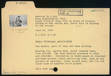 | Description: | One handle, part of body and base missing. Flat bottom; broad rounded body; narrow neck; flaring lip; two band handles attached to neck and shoulder. Decoration in brown glaze on reserved polished ground: lines encircling body, band of net pattern on shoulder, lines around neck; lip and outer side of handles solid glazed. Pale buff clay. | |