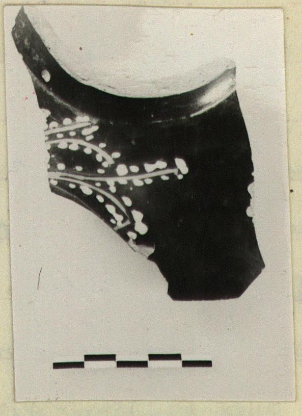 | Description: | Fragment from shoulder, with start of neck lightly offset, from a sizable closed pot. Glazed inside to base of neck only. Preserved are the branches of a tree, the branches reserved, and with relief contour, the leaves of flowers in firm white. Very good glaze. ADDENDA (Sept. 2020), according to Agora XXX, closed: shape uncertain. | |