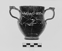 Description:   Mended from many small pieces; fragments of rim and walls missing. Concave-convex type; ring foot, plain rim. Ivy leaf thumb-rest on top of band handles; wreath in thinned clay paint front and back in handle zone.