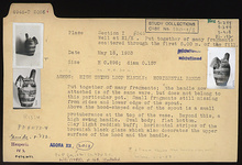 | Description: | Mended from many fragments; small fragments still missing from sides and lower edge of the spout. Above the hood-shaped edge of the spout is a small protuberance at the top of the vase. Beyond this, a high swung handle. Oval body; flat bottom. Clay light reddish-buff; horizontal stripes of the brownish black glaze which also decorates the upper surface of the hood and the handle. | |