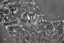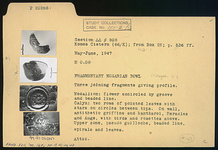| Description: | Three joining fragments giving profile. Restored in plaster. Medallion: flower encircled by groove and beaded line. Calyx: two rows of pointed leaves with stars on circles between tips. On wall, antithetic griffins and kantharoi, Herakles and Auge, with birds and rosettes above. Upper zone, pseudo guilloche, beaded line, spirals. Attic. | |