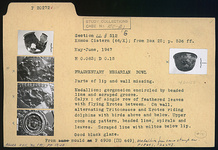 | Description: | Parts of lip and wall missing. Restored in plaster. Medallion: gorgoneion encircled by beaded line and scraped groove. Calyx: single row of feathered leaves with flying Erotes between. On wall, alternating Tritonesses and Erotes riding dolphins with birds above and below. Upper zone egg pattern, beaded line, spirals and leaves. Scraped line with miltos below lip. From mold P 6908 (ΠΘ 649). Good black glaze. ADDENDA Medallion from same stamp as P 18641 and P 20273. | |