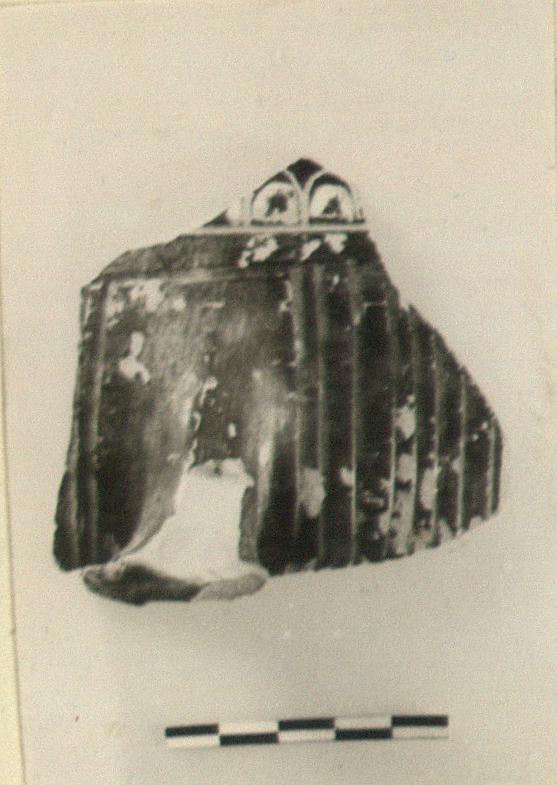 | Description: | Fragment of wall and attachment of rope handle preserved. Vertically grooved on either side of handle. Below, egg pattern in applied white and incision. Black glaze inside and out. Attic. ADDENDA Cf. relief skyphos (third quarter of 4th c. probably) from the Isthmus of Corinth, AJA 58 (1954), pl. 45, fig. 4: similar handle form. | |