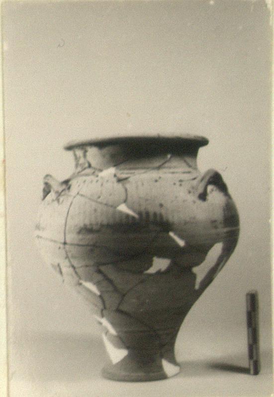 | Description: | Part of one handle and minor fragments of body and lip missing; restored in plaster. Short neck with projecting lip; body widest at shoulder, tapering into small foot; three loop handles set horizontally on shoulder. Decoration: red glazed bands of various widths, with band of rays around shoulder. Buff clay. | |