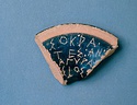Complete ostrakon. Incised underneath: Σοκρά/τες: Αν/αγυρά/σιος