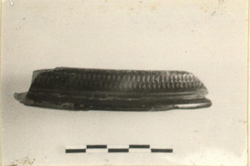 | Description: | Rim fragment. Keeled rim with nicked decoration above. Gray micaceous clay. Black glaze. Samian Ware. | |