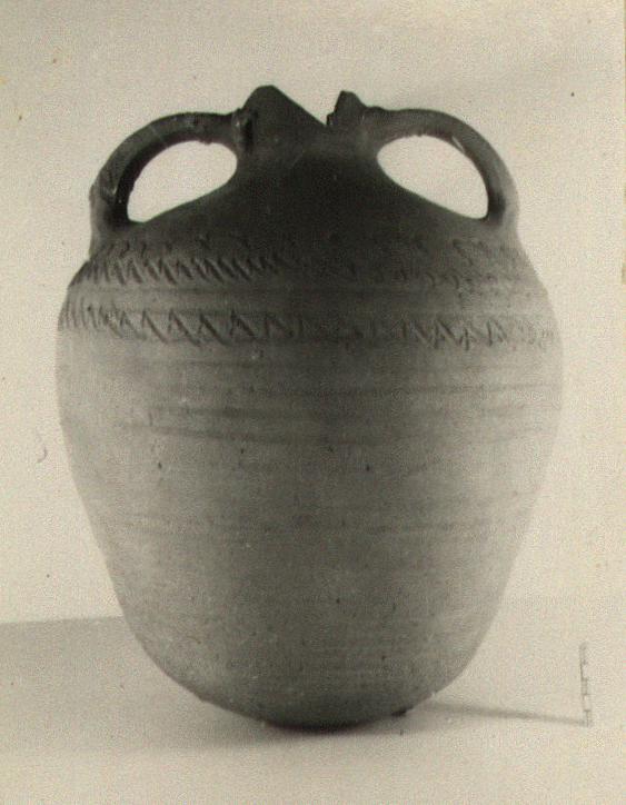 | Description: | Lip missing, hole in one side. Plump amphora with rounded bottom and broad shoulder. Three lines of incised zigzag on shoulder. Gritty red-brown clay, shallow wheel grooves on sides. | |