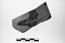 | Description: | Decoration in panels. Fragment from the upper part of the panel showing a small bit of the black neck at the top. Depicts the head (except the crown of the casque) and the upper part of the torso of a warrior, right. He wears a bordered chiton and his right arm is bent to the height of this right breast and holds a spear. At the right appears the mane of his horse, incised. Brown-black glaze fired red in places; red for casque, chiton, spear; white for dots of edge of chiton. Unglazed on interior except on inside of mouth. Outlines of arm and spear incised. | |