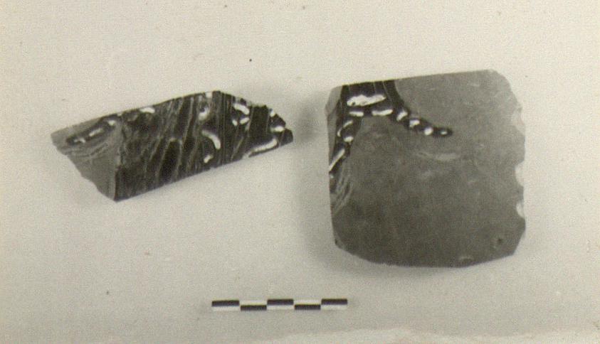 | Description: | a) Joins P 5224. Fragment from lower part of Athena's peplos, showing edges of overfold. Ground pale orange. White on edges of garment. b) A swallow-tail end of Athena's himation. | |