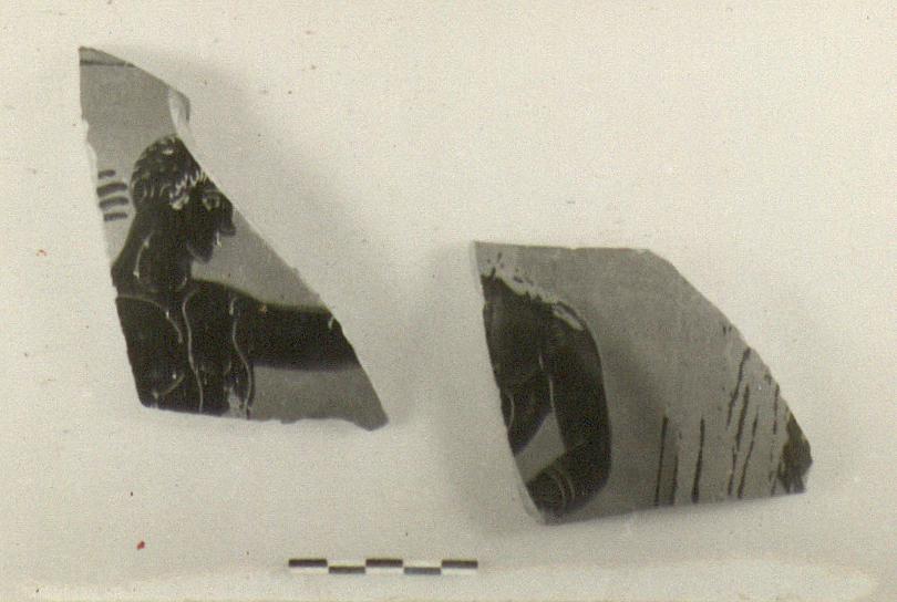 | Description: | a) Fragment depicts neck, left shoulder and arm of boxer facing left, wearing heavy boxing glove. Orange-pink ground. b) Face and chest of an athlete facing right, left arm extended, right hand raised behind his head. Cf. P 20378. | |