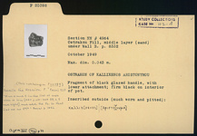 | Description: | Fragment of black glaze handle with lower attachment; firm black on interior of pot. Inscribed outside (much worn and pitted): <graphic> | |