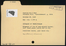 | Description: | Fragment of rim of semi-glazed krater; dull black glaze inside and on rim. Inscribed inside, just below rim: <graphic> | |