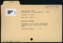 Description:   Fragment of thin-walled closed pot; mottled red to black glaze outside only.