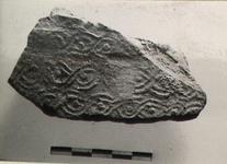 | Description: | Broken all around. Fragment from side with guilloche pattern in relief. Thick fabric, red at core, light brown and highly micaceous on surface. | |