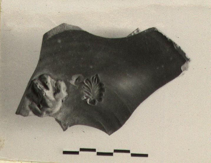 Description:   Fragment from floor of bowl with vertical rim (missing) and small low ring foot. Palmette stamp. In applied relief, a small frog.