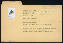 | Description: | Small piece from wall of calyx krater. Shoulder and back of head of maenad, moving right, thyrsos over her shoulder. Relief lines; hair-ribbon in added red. ADDENDA (Sept. 2020), according to Agora XXX, Bell or Calyx Krater fragment. | |