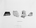| Description: | Irregular fragment from upper shoulder of closed pot, preserving above one-third of circumference of hole. On outside, remains of one set of concentric circles from "canonical" decoration of closed pot; reddish-brown glaze. On inside, broad stroke of black to brownish glaze in reticulate patterns; glaze running down into hole. Pinkish-buff clay. ADDENDA Agora Sample no. 506. Neut. Act. Anal. Brookhaven, May 1978. | |