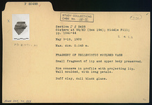 | Description: | Small fragment of lip and upper body preserved. Rim concave in profile with projecting lip. Wall moulded, with long petals. Buff clay, dull black glaze. | |