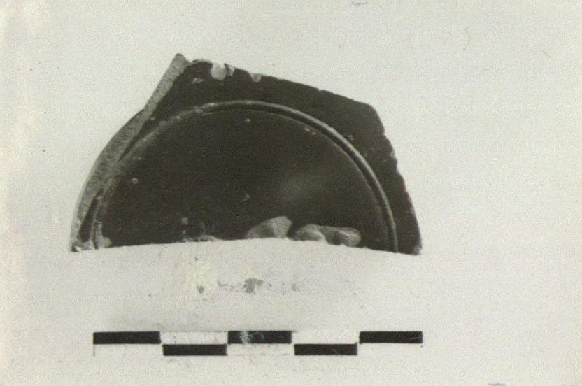 | Description: | Half of base and adjoining floor preserved. Ring foot. Grooved circle on interior. Bit of stamp at edge of break; nothing legible. Buff clay. Red glaze. | |