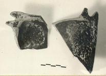 Description:   Two corner fragments of a square or rectangular flat-bottomed shallow bowl (or lid). At each corner a projecting prong.