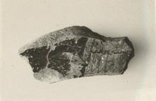 | Description: | Probably from the shoulder of a large pot; a bit of the upward curve toward the neck remains. Head of youth, right. Curiously angular profile, with completely profiled eye. Part of a wing. Relief contour for the face; the inner markings of the wing brown and a few locks around the face. White for the boy's wreath, now vanished. | |