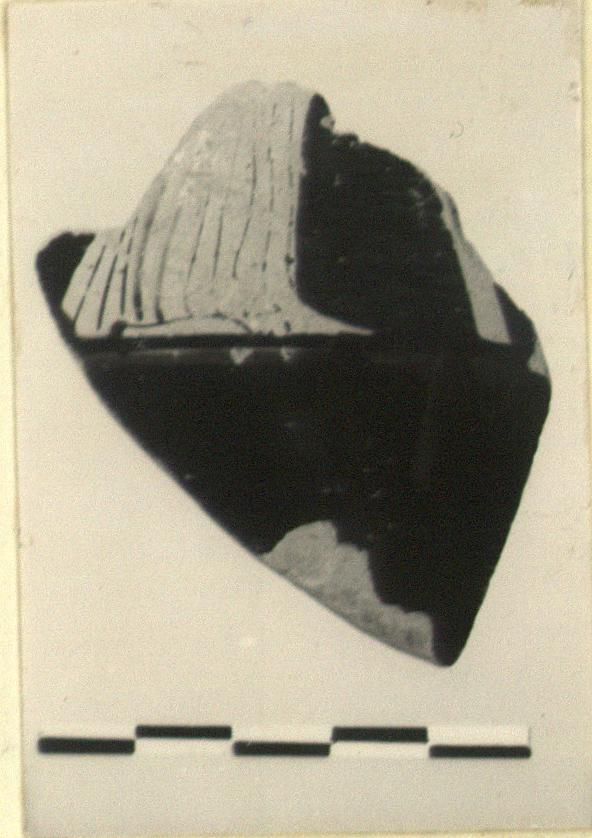 | Description: | Lower part of a draped standing figure to right, with part of some object in front of her. No relief contour. Interior: streaky glaze. | |