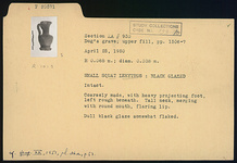 | Description: | Intact. Squat shape; heavy projecting foot, left rough beneath; tall neck, merging with round mouth; flaring lip. Dull black glaze, somewhat flaked. | |