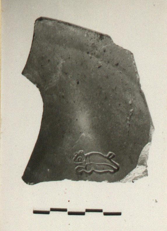 | Description: | Fragment of floor with parts of foot. Low ring foot. Stamped on the floor a small creature, rather like a rabbit, but with short ears. Orange-pink clay; thin red wash inside. Late Roman C. | |