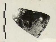 | Description: | From the shoulder of an amphoriskos or squat lekythos. Stamped with pairs of concentric circles in diagonal rows. Pink-buff clay, rather metallic glaze, somewhat worn. Cf. Langlotz (1932), Würzburg, pl. 253, figs, 713, 714. | |