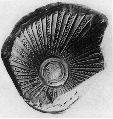 | Description: | Base and a little of side wall remain. Chipped. Rosette, medallion; wall, jewelled rays. Fine buff clay. | |