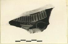| Description: | From shoulder of a lebes gamikos; plastic ring at start of neck. Head of a woman to left and top of a loutrophoros; flowers in added red in loutrophoros, extending up to tongue pattern above; the woman is probably tying fillets around the loutrophoros. | |
