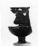 | Description: | Mended from several fragments; handles and much of rim and upper wall missing; profile complete. Simple cup foot with short stem. Deep rounded lower body lightly offset from steep upper wall; plain slightly flaring rim. Good blue-black glaze. Vertical face of foot, resting surface and center of cone within foot reserved. Two scraped grooves around stem, one at junction with bowl, the other below. Decoration on upper wall just below rim: ivy wreath, the leaves reserved, the stems and berries in faded white. For the wreath, cf. P 2322; for the shape, Richter and Milne (1935), fig. 169, with same foot, but cup more squat. | |