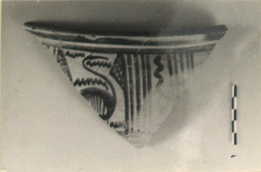 | Description: | Fragment of rim and body of a large krater. A long-necked bird in a panel, flanked by groups of vertical lines; groups of streaks on rim. Inside, streaky glaze. | |