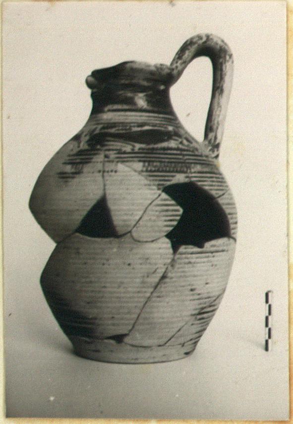 | Description: | Mended from many pieces. Small fragment from mouth and much of side wall missing. Shape as P 20729; better articulated neck and smaller base, high swung handle. Neck and lip glazed solid. On shoulder, reserved panel containing three running beasts (dogs?). Further below: zigzag zone. Surface much destroyed. Dull reddish-brown glaze. Fragments from at least three other oinochoai of same shape and similar decoration in tins. | |