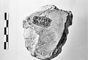 | Description: | Fragment from a large thick plaque; part of surface of back preserved. Two bearded heads and outstretched arms to right. Red, now faded, for forehead hair and for beards. Surface damaged. Two converging incised lines, probably intentional, on back. | |