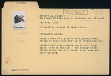 | Description: | Plastic head of a griffin with gaping mouth. Broken at neck; ears and tip of tongue missing. Pinkish-buff clay. Decoration in dull black glaze, worn on one side. The animal's neck glazed solid, and his tongue; ears, eyes and jaws outlined. | |