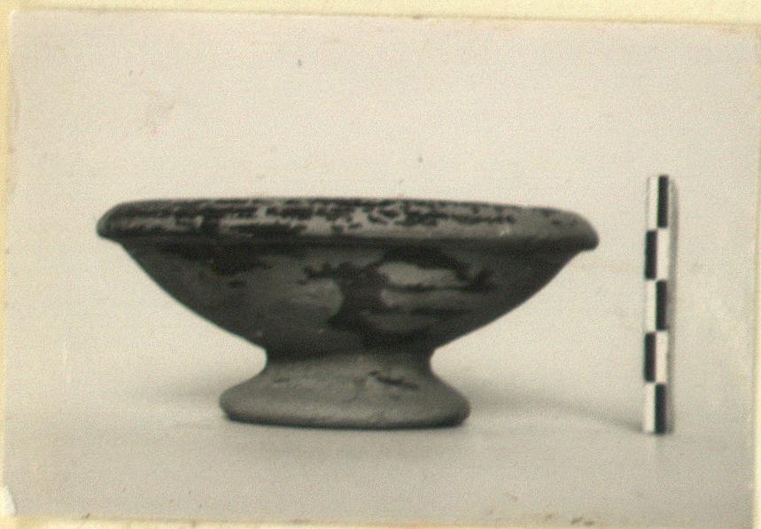 | Description: | Intact. Shallow bowl on conical foot, the rim thickened and sloping downwards. Soft pinkish-buff clay. Thin gray to red glaze, now mostly peeled. Apparently originally glazed all over, save for inner edge of rim, resting surface of foot and center of cone above. | |