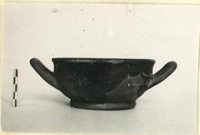 | Description: | Mended from many pieces, several pieces missing, including the one handle, half of the other and half foot; restored in plaster. Substantial ring foot; thick rim with concave profile. Handle inside, handle space, resting surface and bottom reserved; added red line at lower edge of rim. Glaze fired red, badly worn and partly mottled. Cf. Agora XII, no. 568. | |