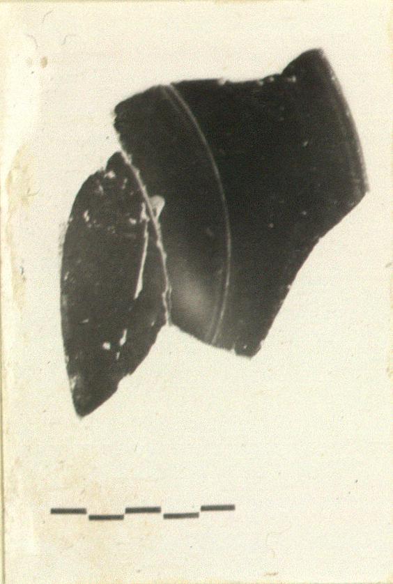 | Description: | Fragment mended from two pieces, preserving the profile to near the center of the floor. Double-curve profile; very low ring foot with two grooves on resting surface. Between the rim and floor there is a neat small ridge. A groove sets off the edge of the rim. Good black glaze. Reserved underneath. | |