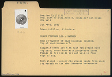 Description:   Small fragment of edge missing; cracked; top of knob broken off. Slightly domed lid with flat rim, offset from top part; round knob with projection above; flange to fit inside pot set well in from edge of rim.