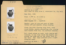 | Description: | Handle, part of rim and part of base broken off and mended; chips missing. Plump jug with flaring ring foot, wide round mouth, narrow projecting rim; rising band handle from rim, its surface concave. Dull black glaze on neck, both inside and outside; in one line below the handle all around the body and on the outer face of the foot. The rest covered with a light brownish wash. Graffito on neck: <graphic> | |
