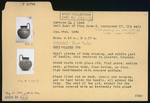 | Description: | Small pieces of body missing; middle part of handle also missing, restored in plaster. Cracked. No foot; flat bottom; globular body; medium neck; round mouth with plain rim, flat above; high band handle with concave surface. Glaze fired red on neck,, inside and out, and on band below the handle, all around the body. The rest of the pot, except for the bottom, covered with an extremely thin glaze wash mostly fired light brown, but occasionally running to red where thicker. Fabric pitted with grit. | |