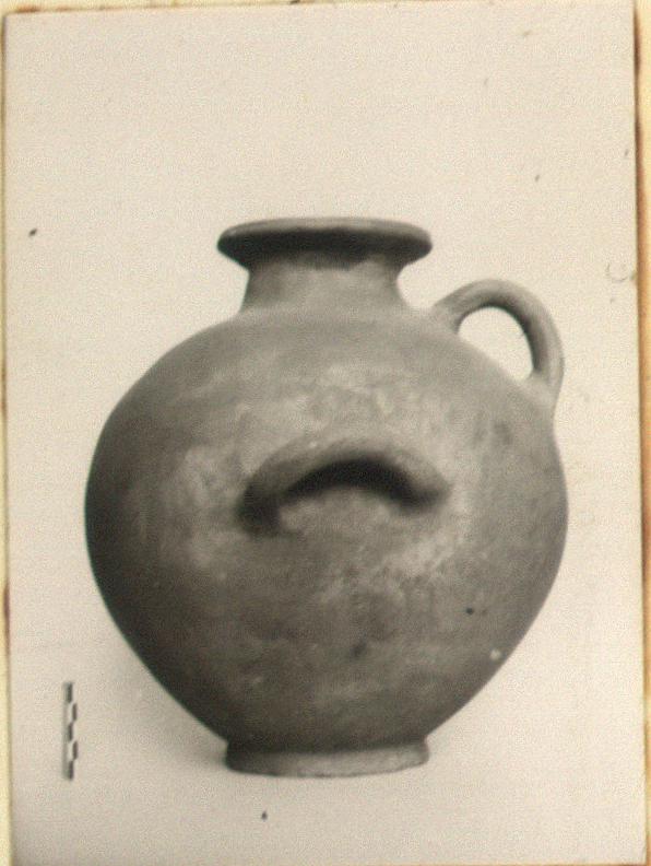 | Description: | Intact except a small fragment of body and small chips of foot. Low ring foot, straight-sided; globular body; rather short neck, spreading towards shoulder; wide projecting rim, its flat top surface lightly set off by a groove; rolled horizontal handles, set on body, at point of greatest diameter, the rolled vertical handle just below the neck. Brown micaceous fabric; the surface somewhat worn. Cf. Agora XII, no. 1594. Many rim and base fragments of similar hydrias stored with pottery; including one ring foot with three holes. | |