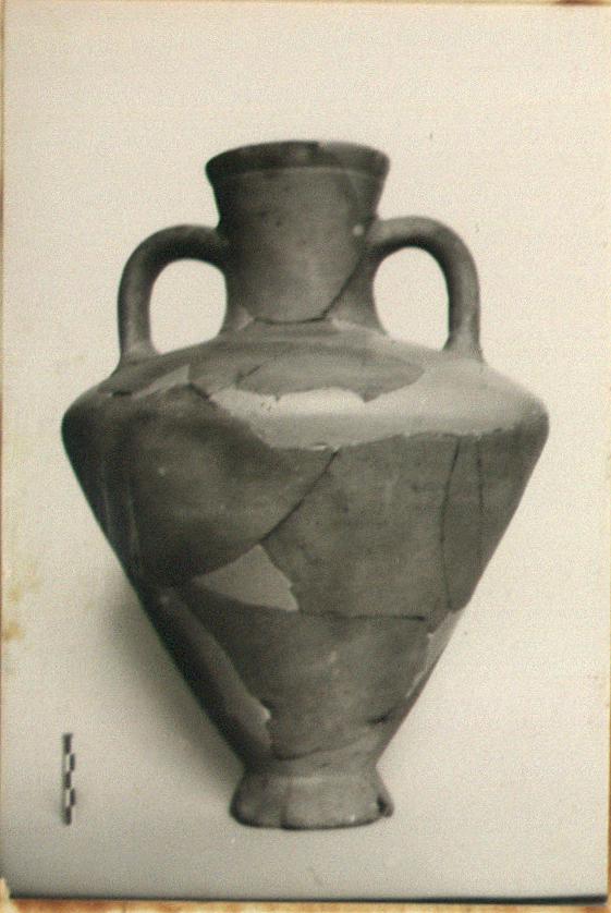| Description: | Mended from many fragments; several pieces missing, restored in plaster. Small amphora with angular profile, the shoulder slightly rounded on top, the walls tapering sharply to a small high flaring ring foot; neck flares slightly to plain rim, marked off by groove outside; handles from near middle of neck to above angle of shoulder. Finger impression at lower attachments. Reddish-buff clay. | |