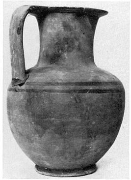 | Description: | Most of rim and large part of neck missing. Handle recovered from pottery lot. Ring base, cylindrical neck, round mouth with flat projecting rim. Outside unglazed save for top and outer edge of rim, two bands just below lower handle attachment and one at junction of foot and body. Buff clay, pink at core; pale buff slip. | |