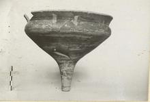 | Description: | Mended from a number of pieces; some wall and rim fragments, and the handle, missing. Large wide funnel, with neat flaring rim. Horizontal handle attached at junction of rim and wall. Pinkish-buff clay; matte red glaze, firm inside, worn and streaked outside. | |