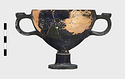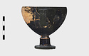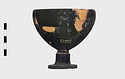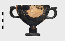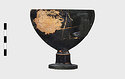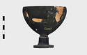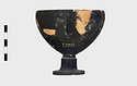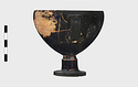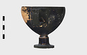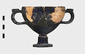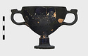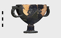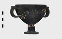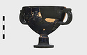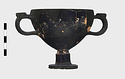 Description:   Foot, rim fragments and both handles missing; restored in plaster. Hemispherical cup with horizontal handles on stemmed foot. Broad band of decoration in handle zone: tendrils, ivy leaves and berries, all in added clay.