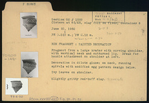 | Description: | Fragment from a large krater with curving shoulder and vertical neck with out-turned lip. Break for handle attachment on shoulder at left. Decoration in dilute glaze: on neck, running spirals with modified egg pattern design below. Ivy leaves on shoulder. Slightly gritty red-buff clay. | |