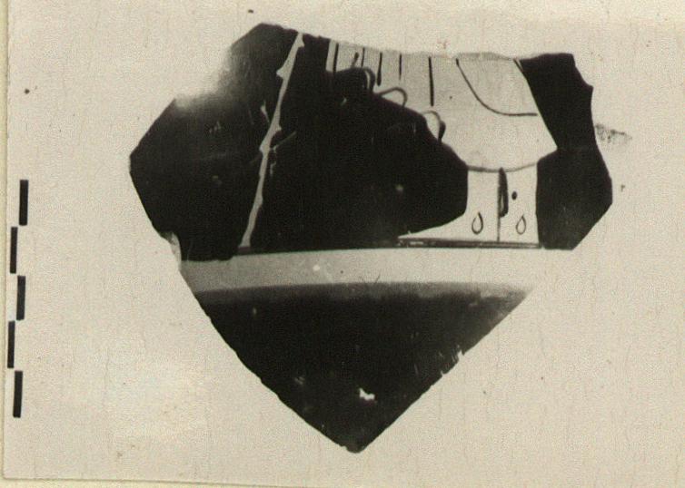 | Description: | Single fragment from lower side wall. Feet and bottom of drapery of standing figure, left, with knotted staff in front of him. Traces of a second figure, behind first. Added red band below ground line. | |
