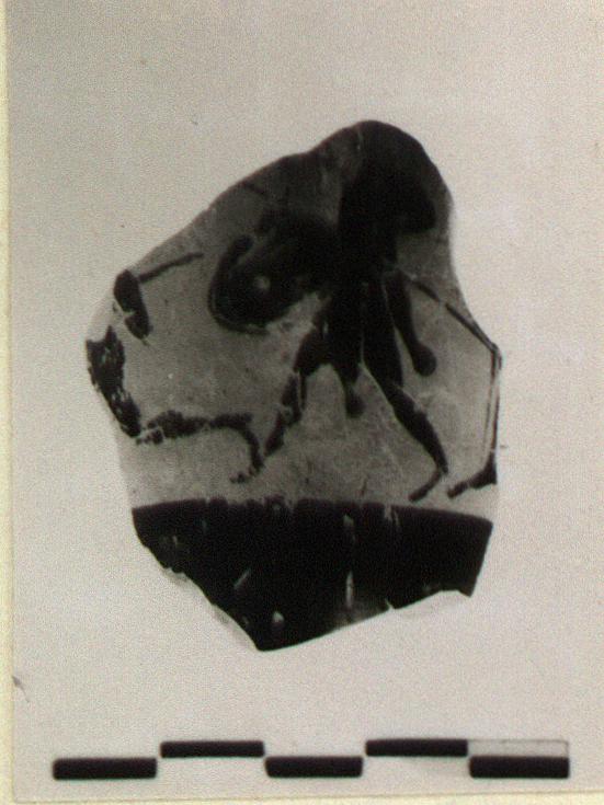| Description: | From the side of a small lekythos. Parts of three figures, left: the two first, warriors; of the third, only one leg is preserved. The central figure wears an animal skin. Coarse work. | |